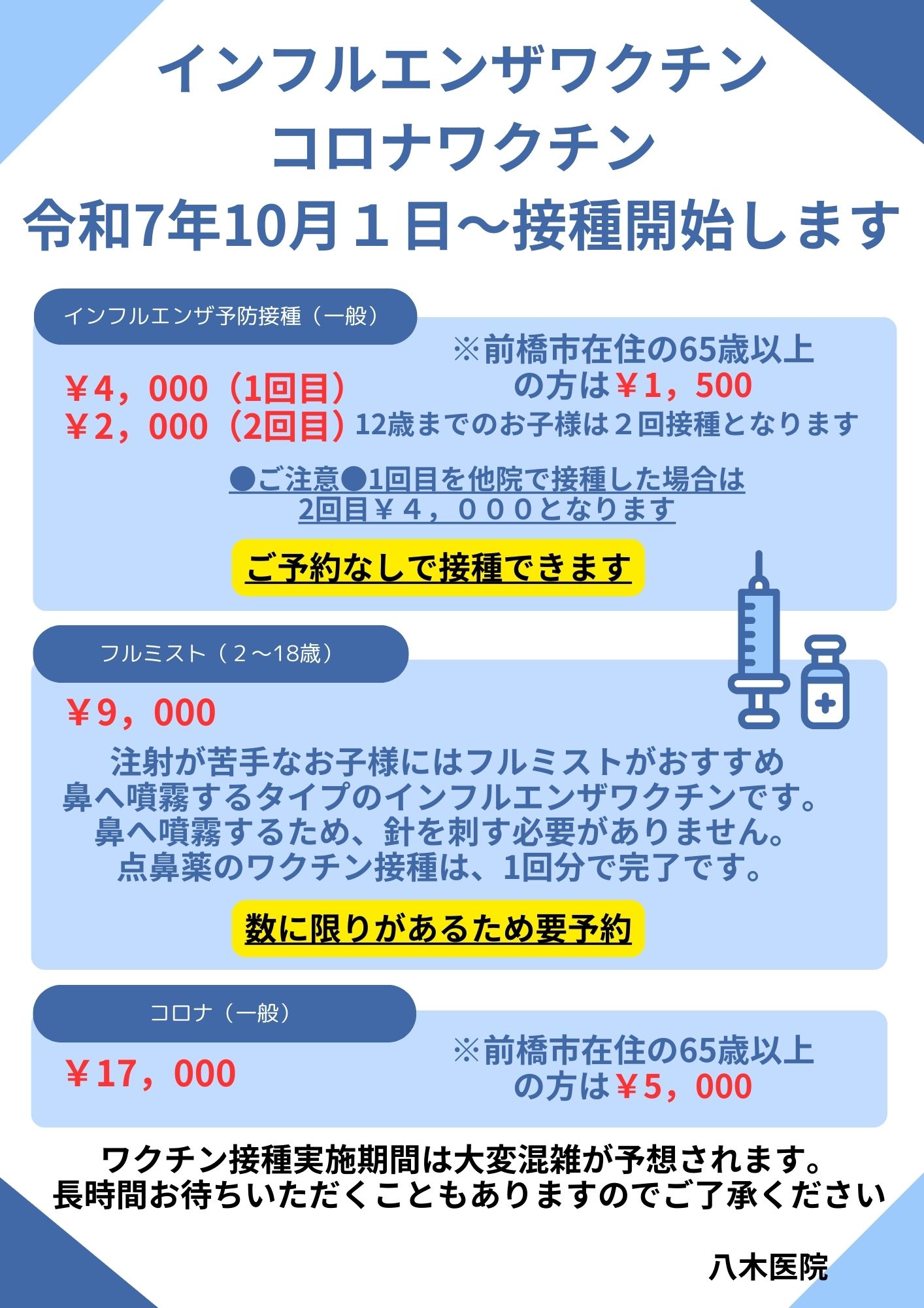NEWSお知らせ 2025/09/26予防接種(インフルエンザ・コロナ)のお知らせこんにちは、八木医院です😊インフルエンザワクチン、コロナワクチンの予防接種のご案内です✨予約なしで接種可能です。フルミストは予約制になりますので、ご注意ください💉 お知らせ一覧