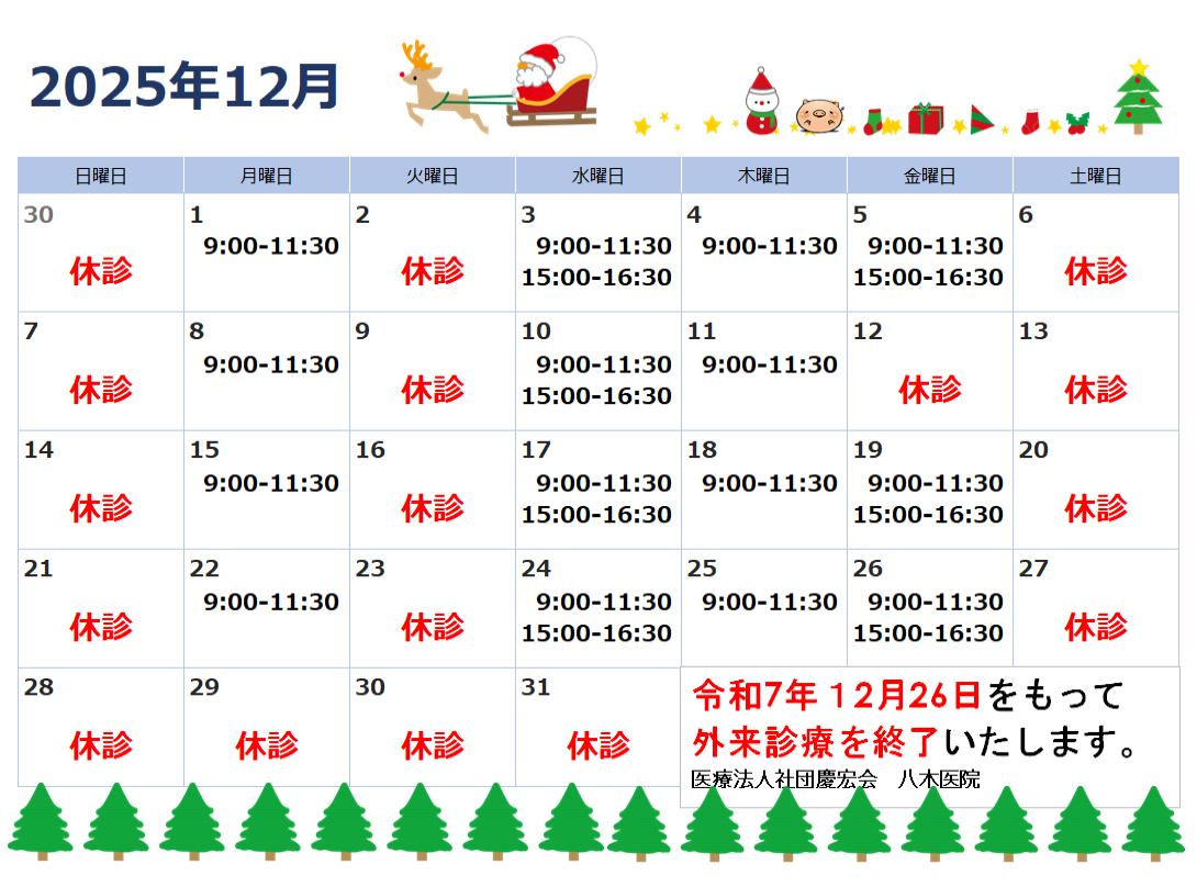 NEWSお知らせ 2025/12/0112月のカレンダーができました!こんにちは八木医院です。 寒くなってまいりましたので、体調にお気をつけてお過ごしください😊 12月の診療カレンダーです📅第2金曜日を休診とさせていただきます。よろしくお願いいたします。 お知らせ一覧